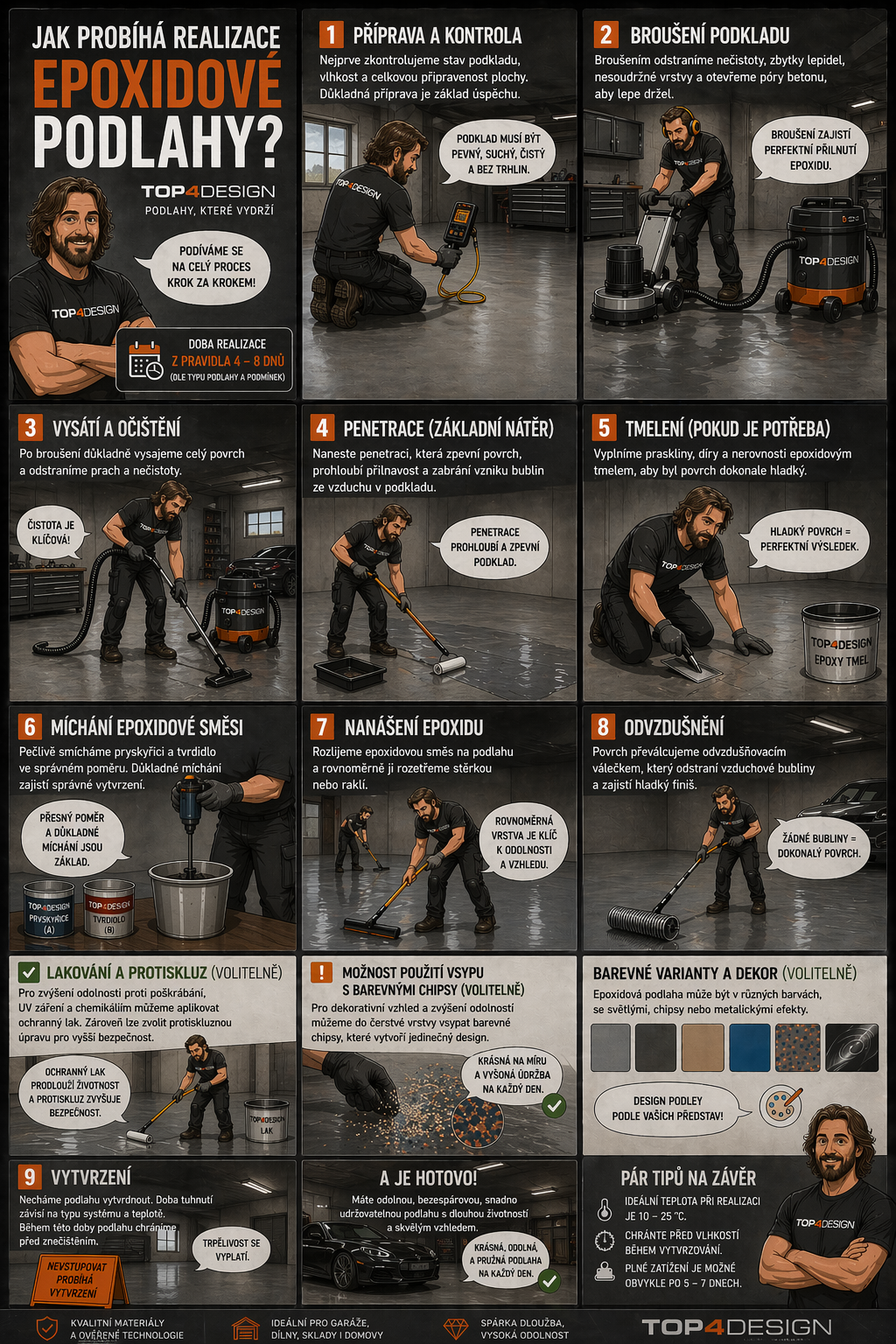 Realizace epoxidové podlahy obvykle probíhá v několika krocích:
